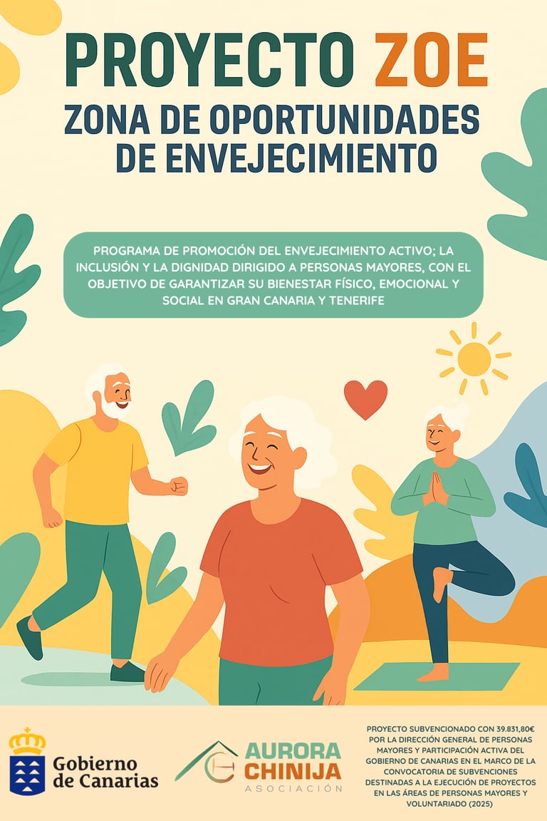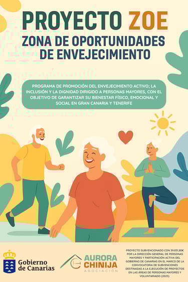 El proyecto ZOE, desarrollado por la Asociación para la Promoción de la Salud y Bienestar Social Aurora-Chinija , es una iniciativa integral diseñada para promover un envejecimiento activo, inclusivo y digno en la Comunidad Autónoma de Canarias.
